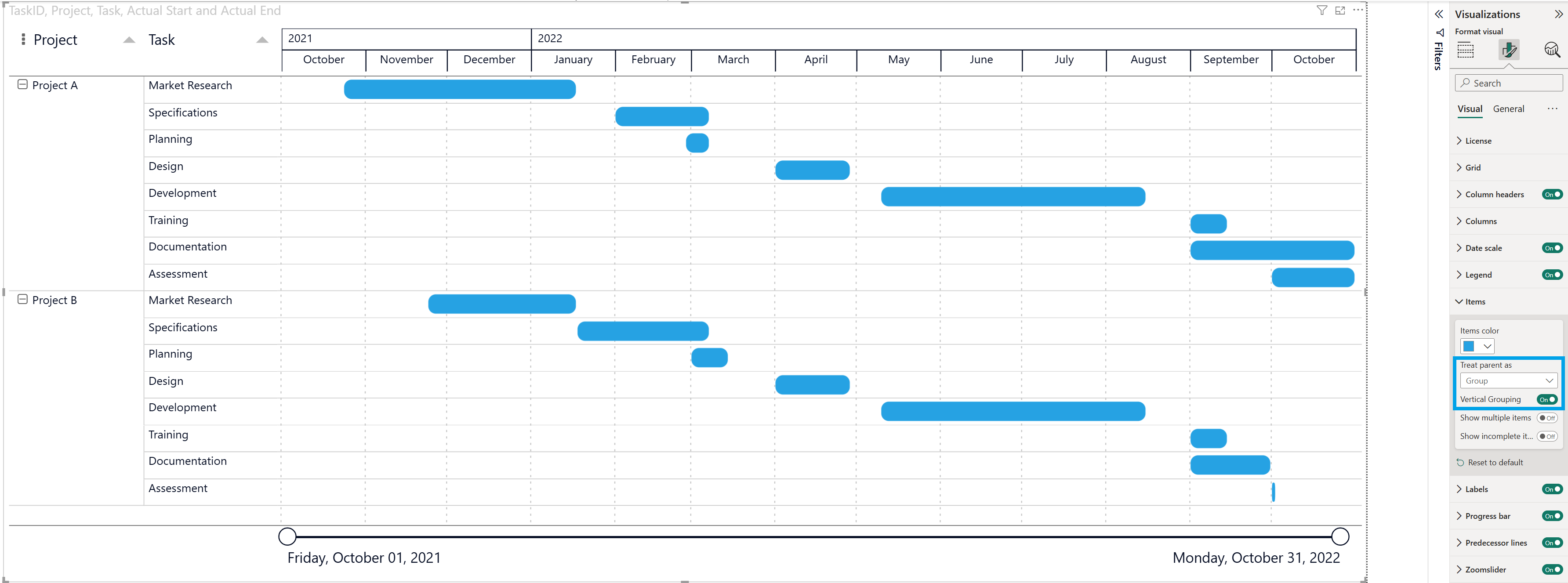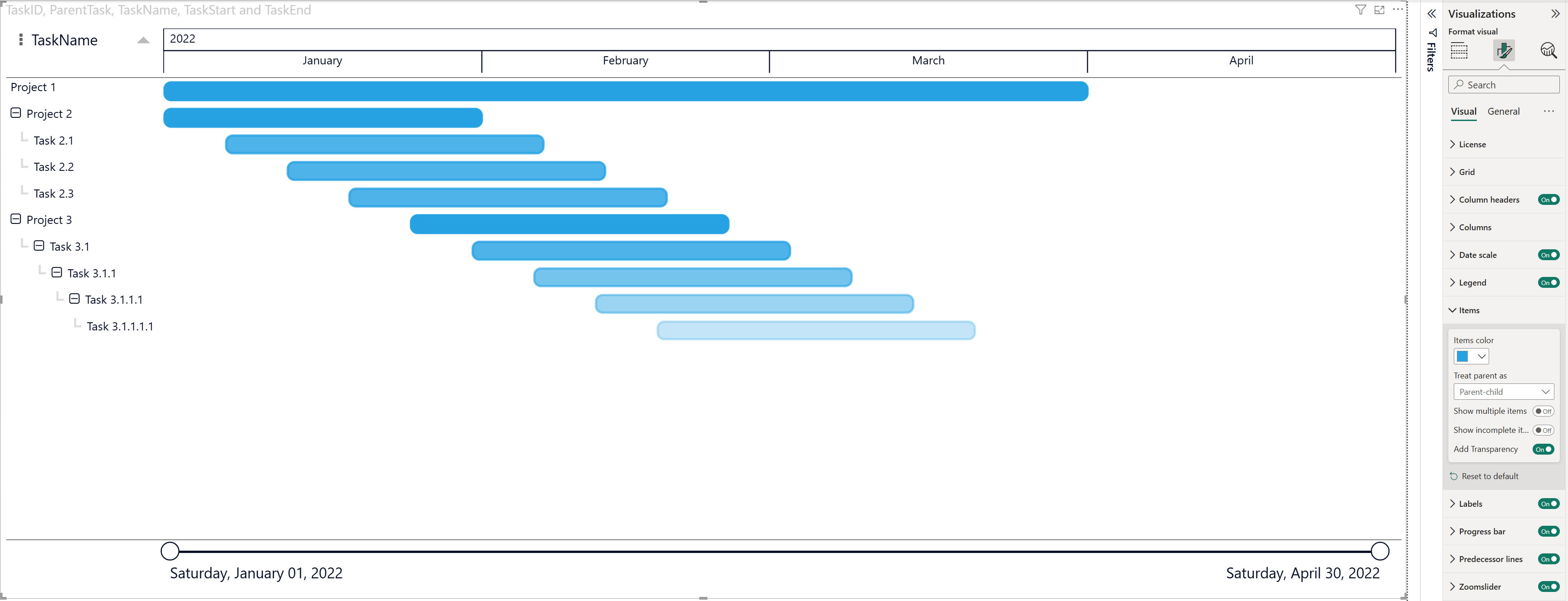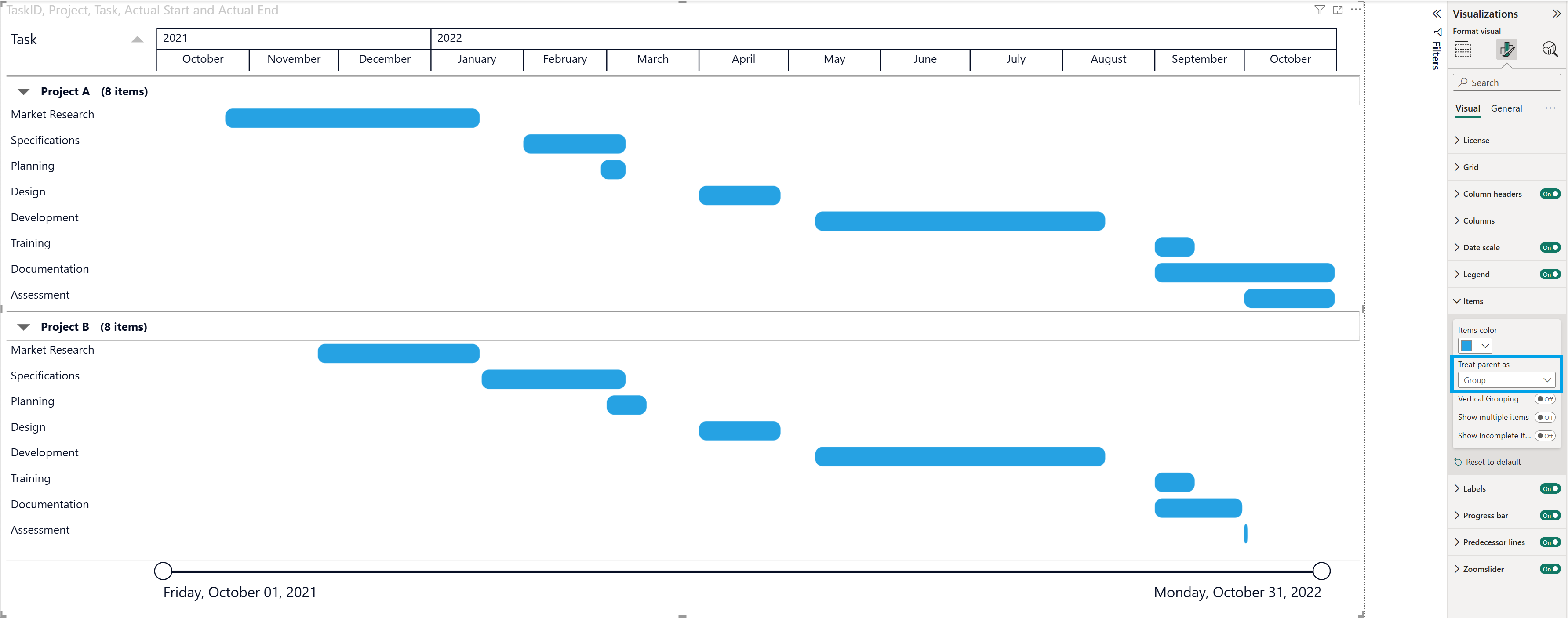 By selecting the appropriate Treat parent as setting, you can control whether the visual renders a true task hierarchy (Parent-child) or a simple categorical grouping (Group), depending on your reporting needs.