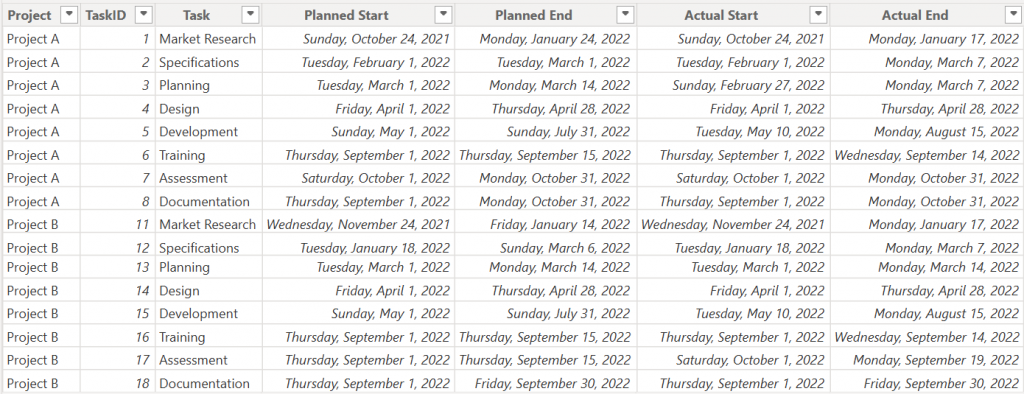 Note: in case an ItemID exists multiple times and has multiple Start dates, then only task with the oldest Start date is shown. To prevent this situation, make sure to only enter data to the ItemID column in rows intended for the milestones. Alternatively, duplicate these rows.