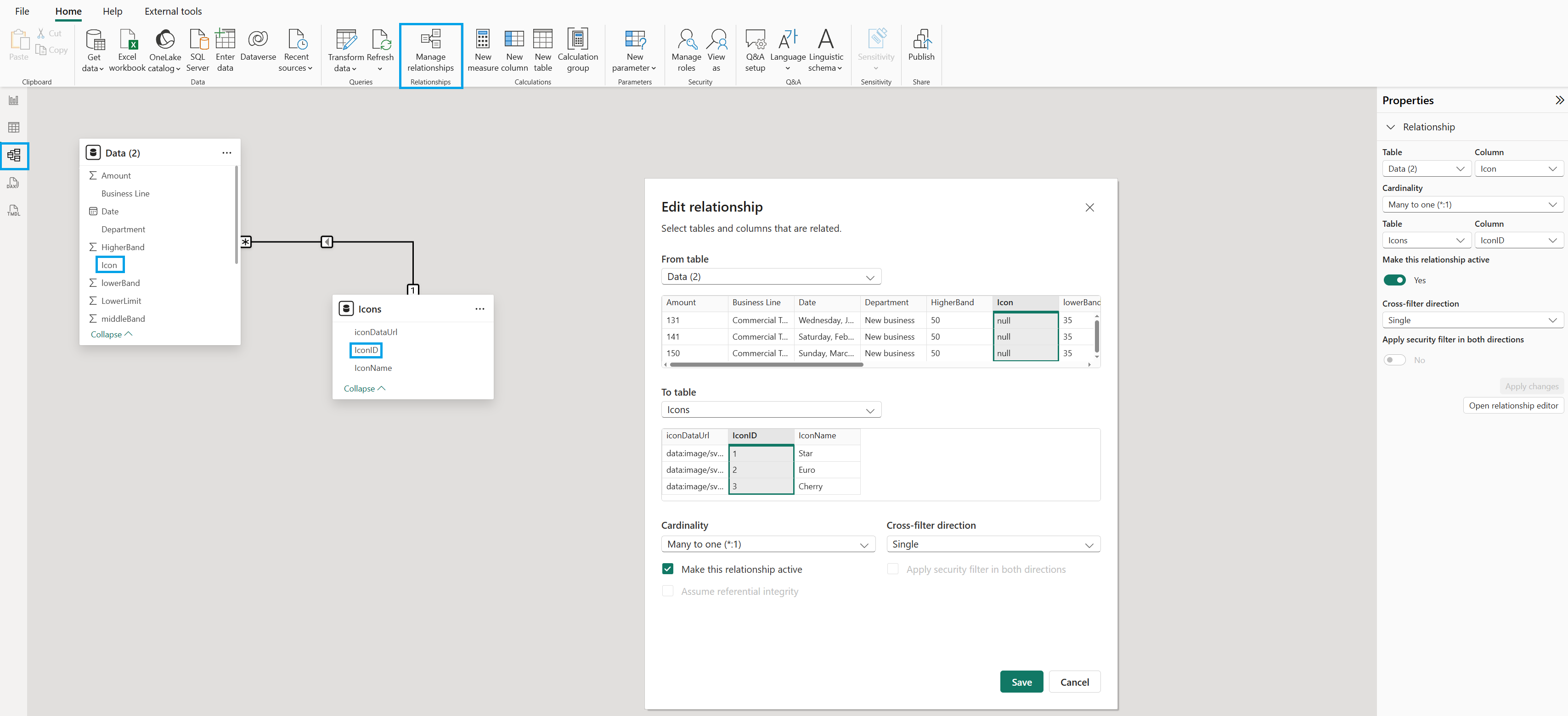 - Copy the generated Base64 code to your “Icons” table and import it into Power BI.